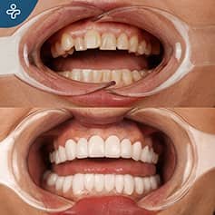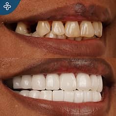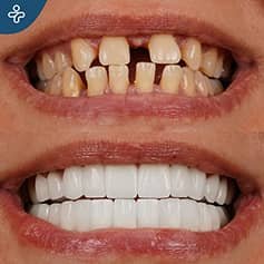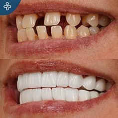 Here is a more fortunate patient, who only required a single dental implant in Turkey, toppling the rest of his teeth with dental crowns for a perfect, uniform smile. Teeth shaving was required to anchor the crowns with excellent smile design results.